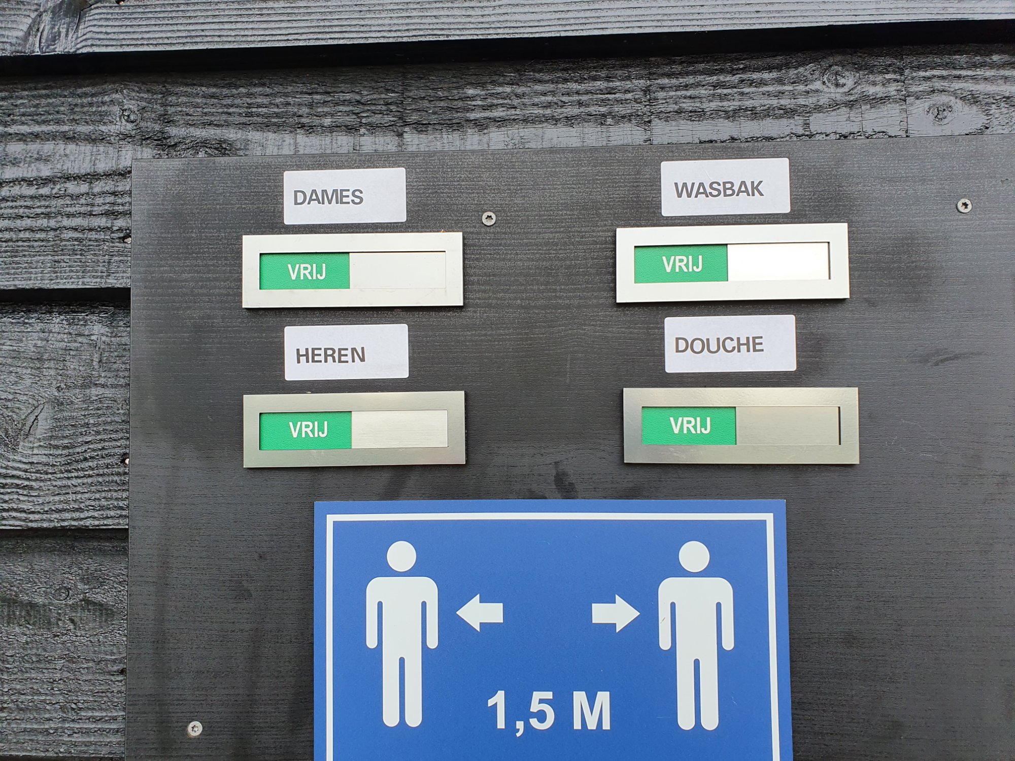 Ga je naar het toilet en ben je een heer: het bordje bij heren kan van groen naar rood. Ga je douchen? Het maakt.niet uit wat je bent maar zet het schuifje even op rood. Bij de ingang zie je meteen wat er nog mogelijk is.