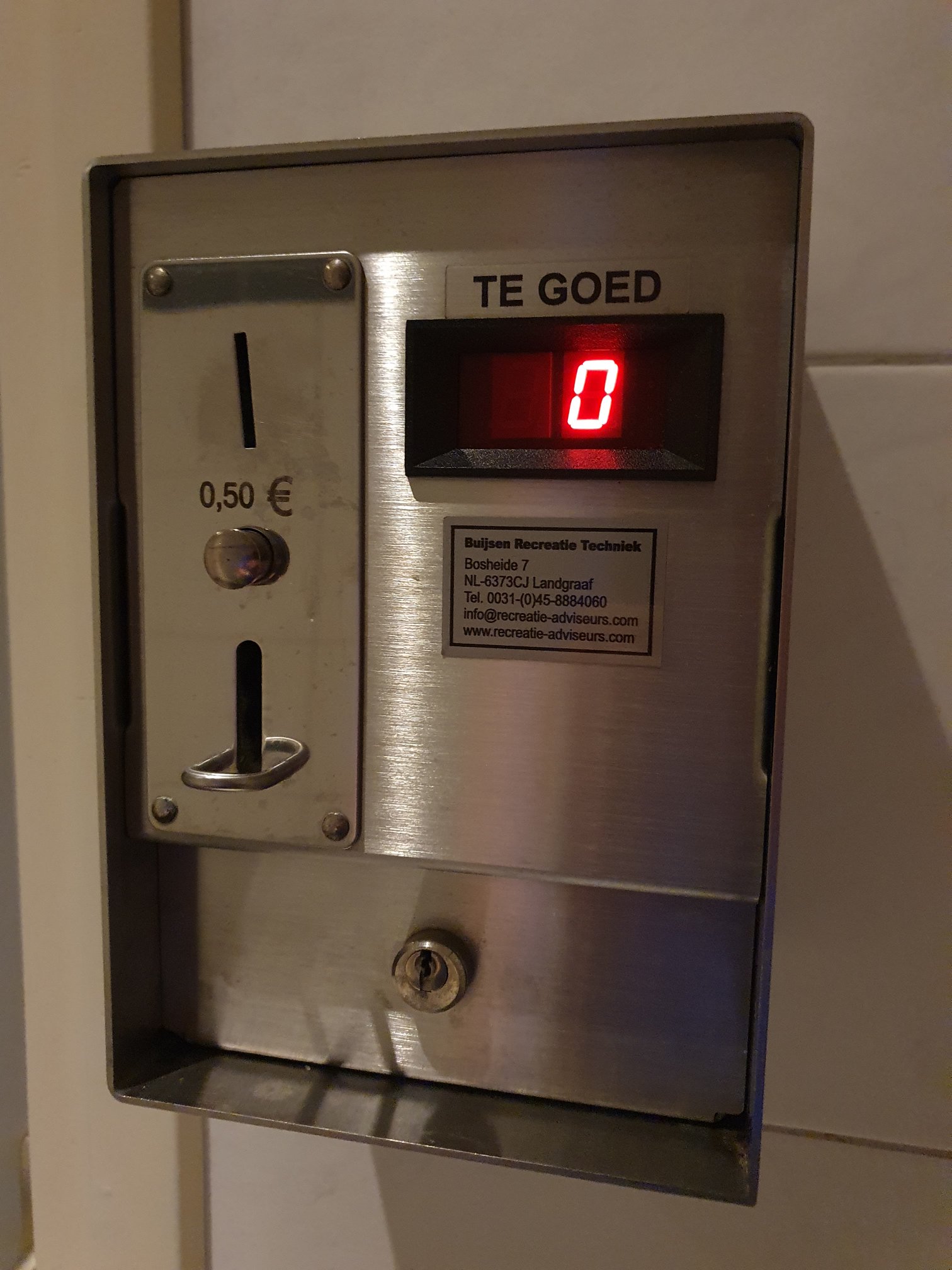 Zo is daar de muntautomaat in de douche. Waarom? Kan dit niet gewoon worden meegerekend bij de overnachting? Zouden er echt mensen zijn die anders drie keer per dag een uur onder de douche staan? Ik geloof er niks van.