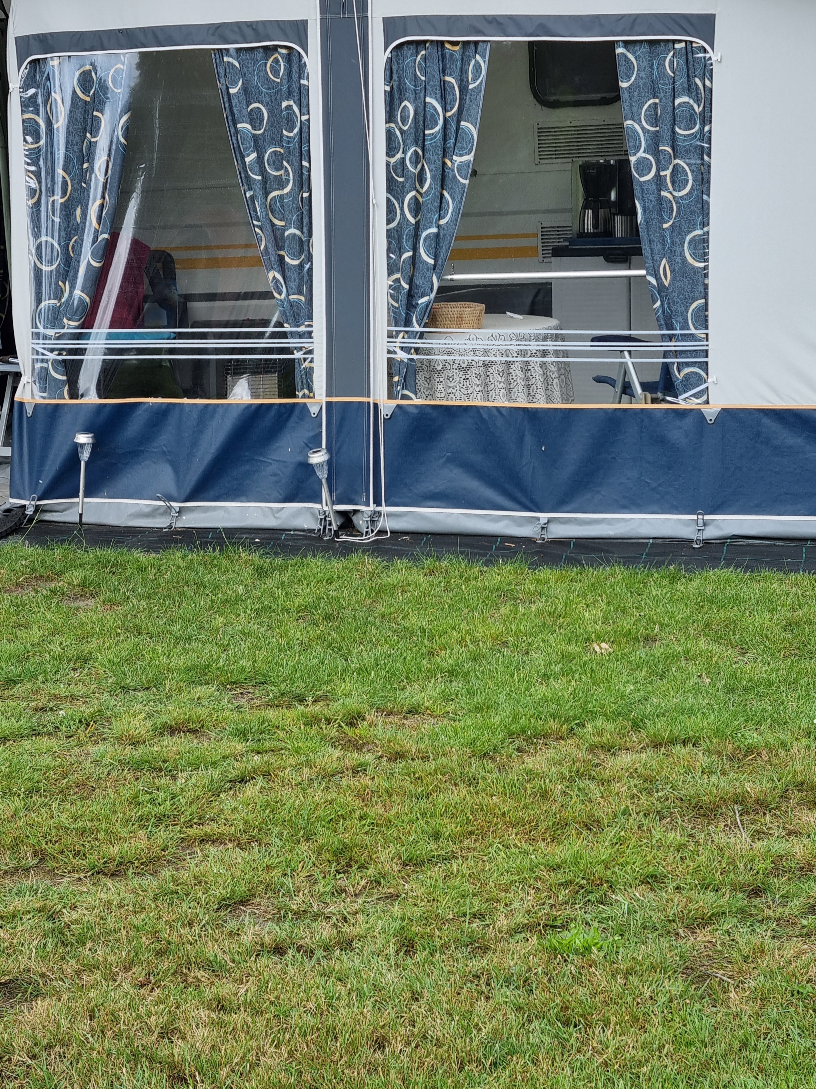 Mooi weer, lekker een vrije dag en we zijn er weer: op de camping. Genieten van…….de plastic tafelzeiltjes!